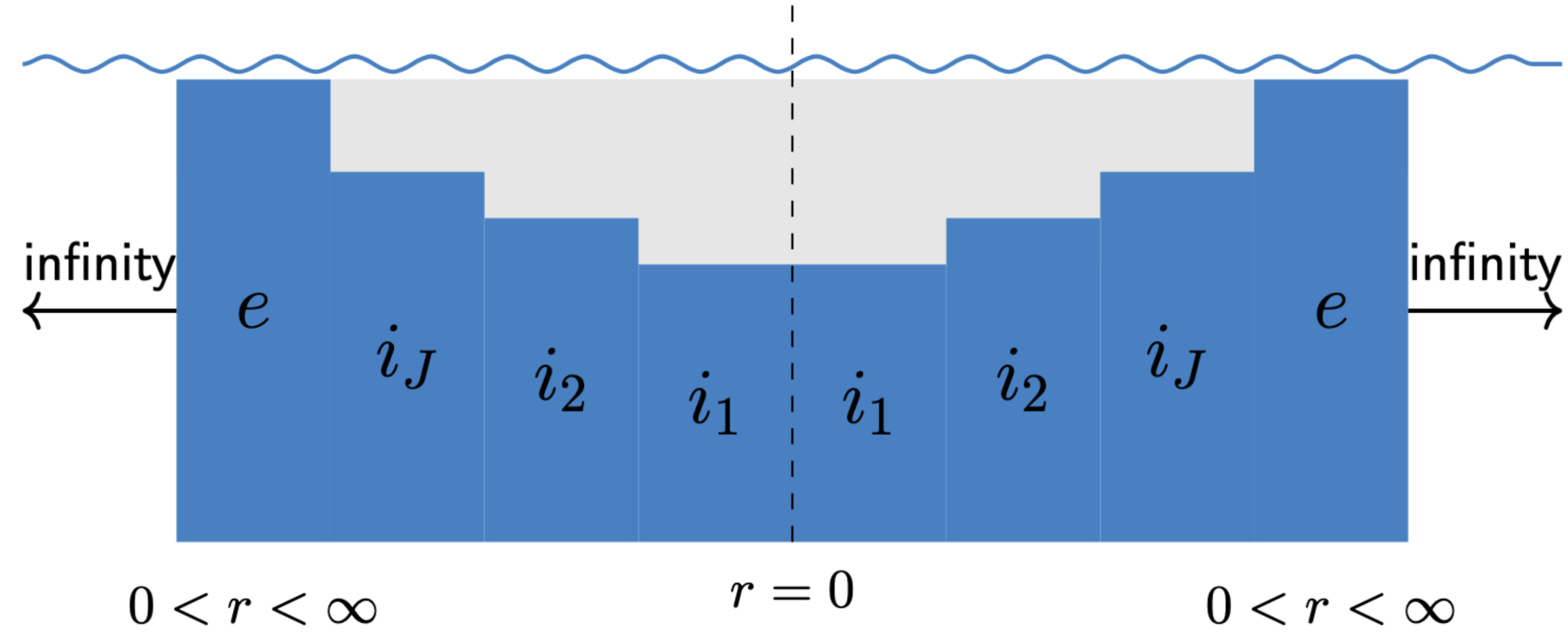 Figure 1: A typical problem geometry is divided into multiple concentric fluid domains, including interior domains under the bodies and a final, semi-infinite exterior domain.¶