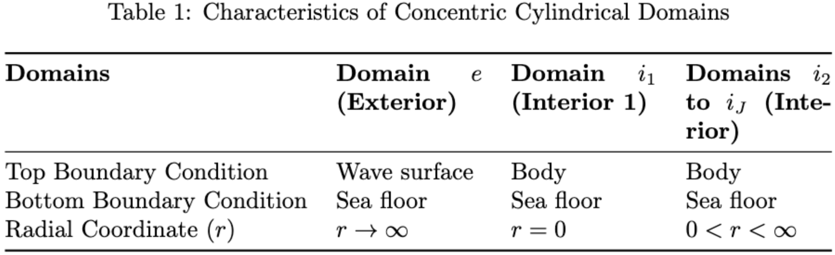The Domain class represents a single, annular (ring-shaped) region of fluid within the simulation. In the Matched Eigenfunction Expansion Method (MEEM), the entire fluid volume is subdivided into these simple domains, each characterized by a constant depth and defined by inner and outer radial boundaries.